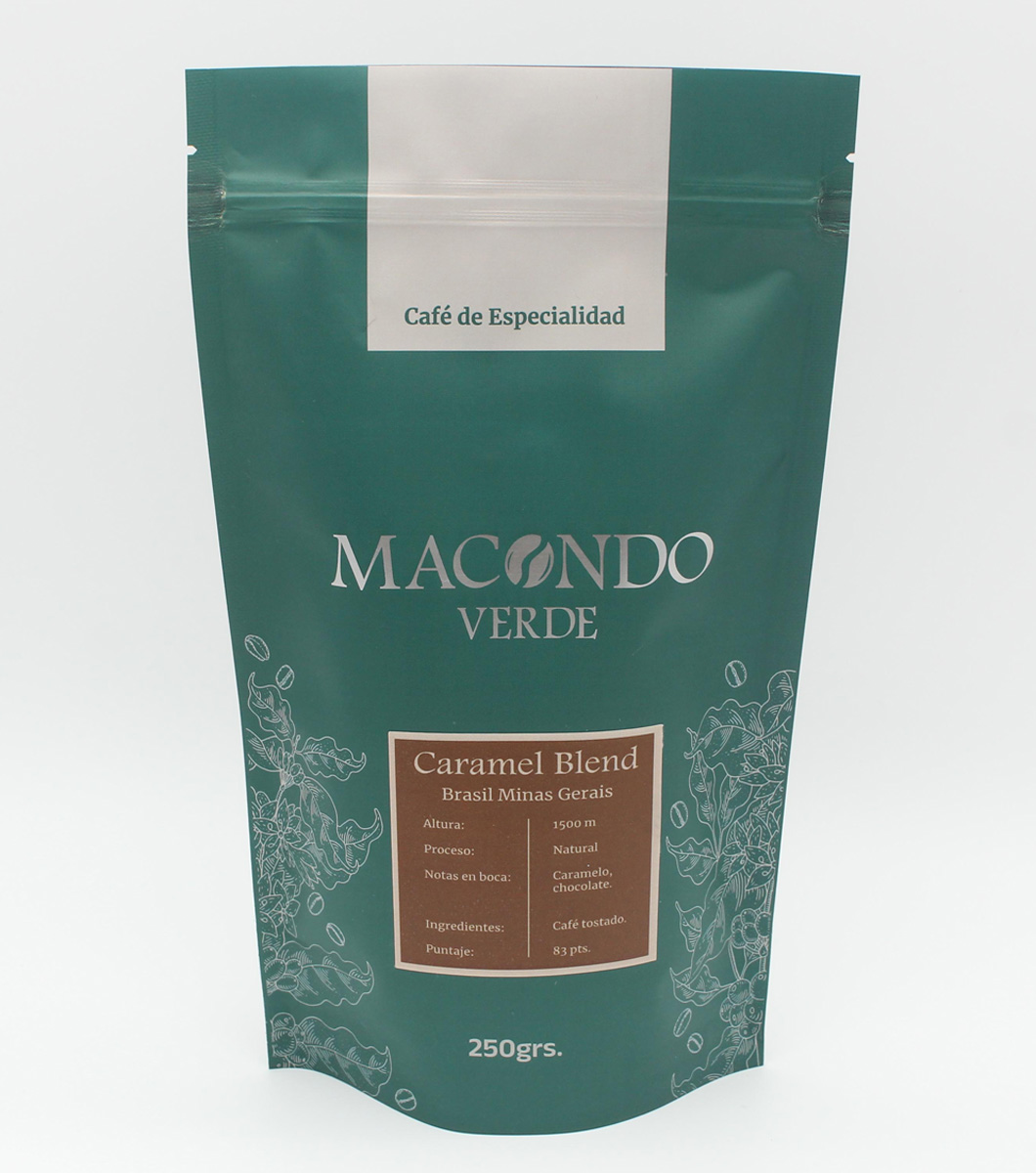 Cafe de especialidad varietal Blend Caramel de origen brasilero el cual se caracteriza por tener un sabor especial dulce con notas en boca a caramelo y chocolate con un perfil de acidez moderado y cuerpo medio ligero.